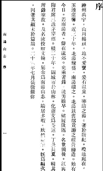 神州禹宇,山川绵亘。地不爱宝,爰有温泉。华清之汤,著于唐纪,琼池宛在,玉液常馨。近三十年,北汤骤盛,南汤继之。北汤以旧都贵游之经营缔造,始有今日。若南汤者,僻在远郊,史乘著录。流芳虽早,裙屐征逐,名世独后。江宁陶君席三,诛茅穿径,积二十年,辟城市于山林,化萧艾为荃蕙,丁丑长夏辑其所录掌故及名流投赠文翰,属余为《南汤山志》。端居多暇,欣然命笔。既为编次,因著其颠末于篇端。二十六年七月仪征严伟......(详情)。