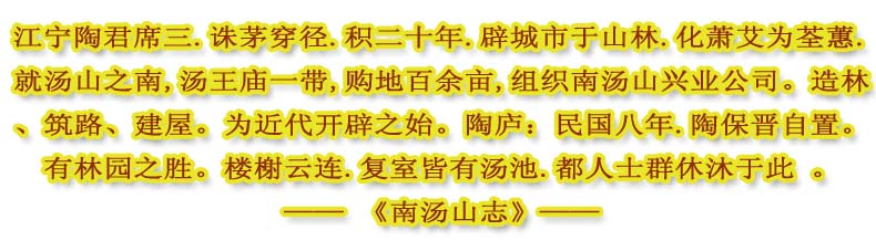 江宁名人陶保晋 (又名陶锡三,1875--1948)民国初年任职江宁“劝学所”视察四乡时,发现汤山泉水潮涌,如汤沸然。他株茅穿径,欲开辟城市於山林。1919年,他与友人史量才等被汤山这片“灵山神水”所感动,集资创办“南汤山兴业公司”,全面发展江宁的地方经济和温泉文化。1920年另购地数亩,接引3号泉源、自建中西合壁的《陶庐温泉别墅》。1937年7月由《陶庐》编辑出版了一部实录汤山开发史的江宁地方志书 ——《南汤山志》,这是一部江宁人民勤奋耕耘、开创人与自然和谐共荣的交响史诗 。