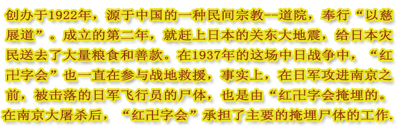 这个“红卍字会”, 创办于1922年,源于中国的一种民间宗教--道院,奉行“以慈展道”。成立的第二年,就赶上日本的关东大地震,所以“红卍字学会”做出的第一个大手笔是发动中国人给日本人捐款--后来真的给日本灾民送去了大量粮食和善款。或许是从那时起,“红卍字会”就给日本人留下深刻印象。在1937年的这场中日战争中,“红卍字会”也一直在参与战地救援,事实上,在日军攻进南京之前,被击落的日军飞行员的尸体,也是由“红卍字会”掩埋的。在南京大屠杀后,“红卍字会”承担了主要的掩埋尸体的工作。